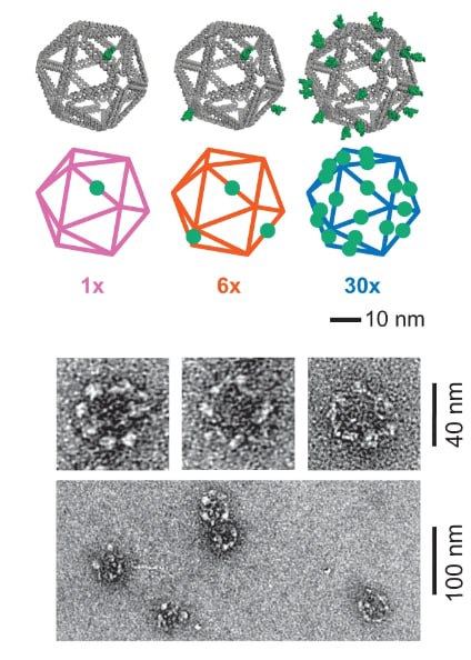 Это конструкция, где роль «бумаги» выполняют молекулы ДНК. Они сворачиваются в жесткий каркас (например, икосаэдр диаметром ~40 нм), на поверхности которого закрепляется множество копий вирусного антигена.